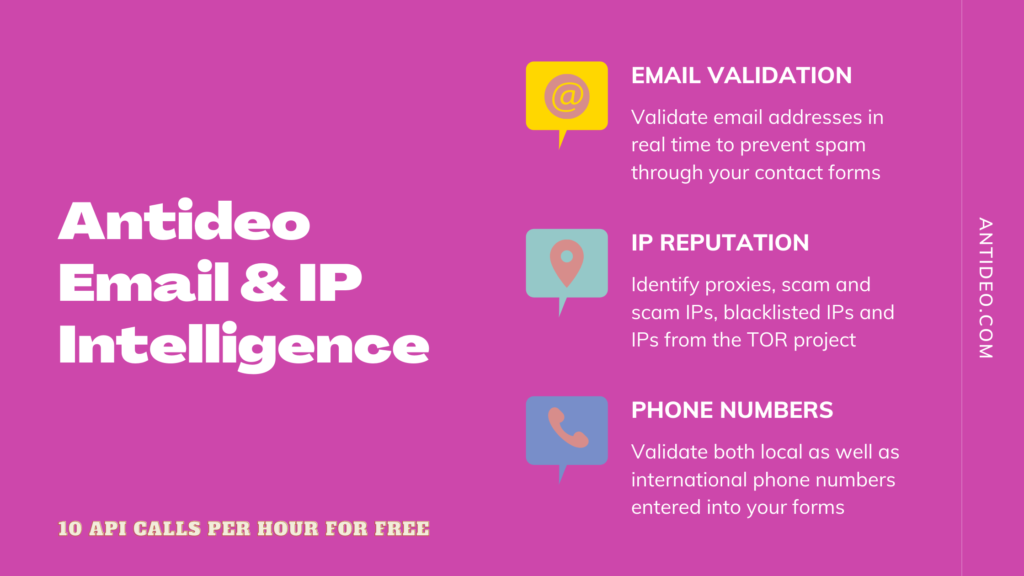The best way to stop spam coming through your website’s contact forms is to use the Antideo API to validate the lead’s information in real time. The API helps you validate several parameters around the lead’s email address and their IP to help determine the legitimacy of the inquiry.