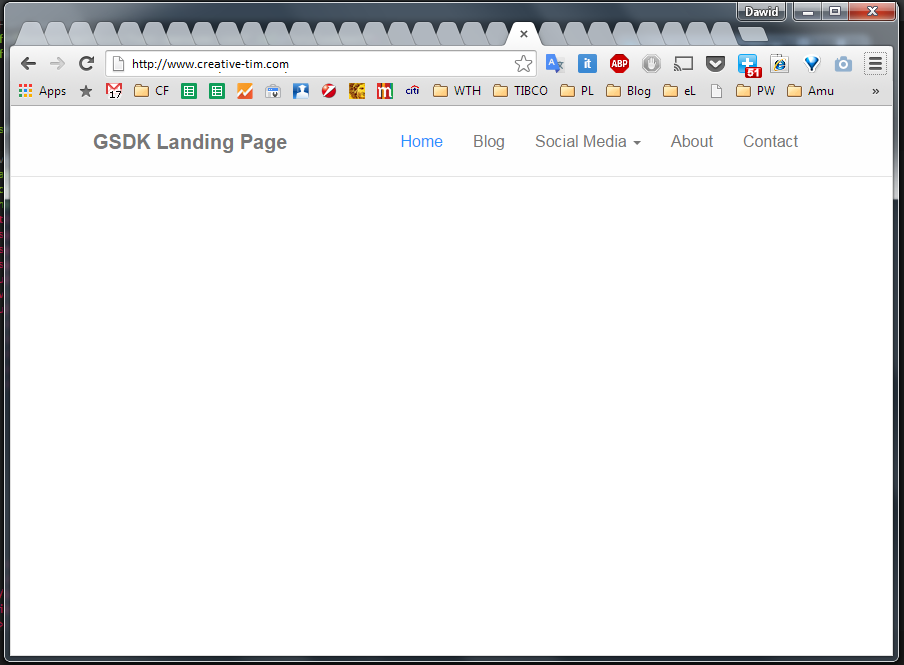 That will create a beautiful static navigation bar on top of the page. In order to adjust it, change your site name, adjust hyperlinks (replace “#” with the addresses of your social media profiles/emails). Except for the fact that this navbar is simply beautiful, it has another important advantage. It is responsive. When a  visitor uses a laptop or a tablet with high resolution, the navbar will be displayed as below: