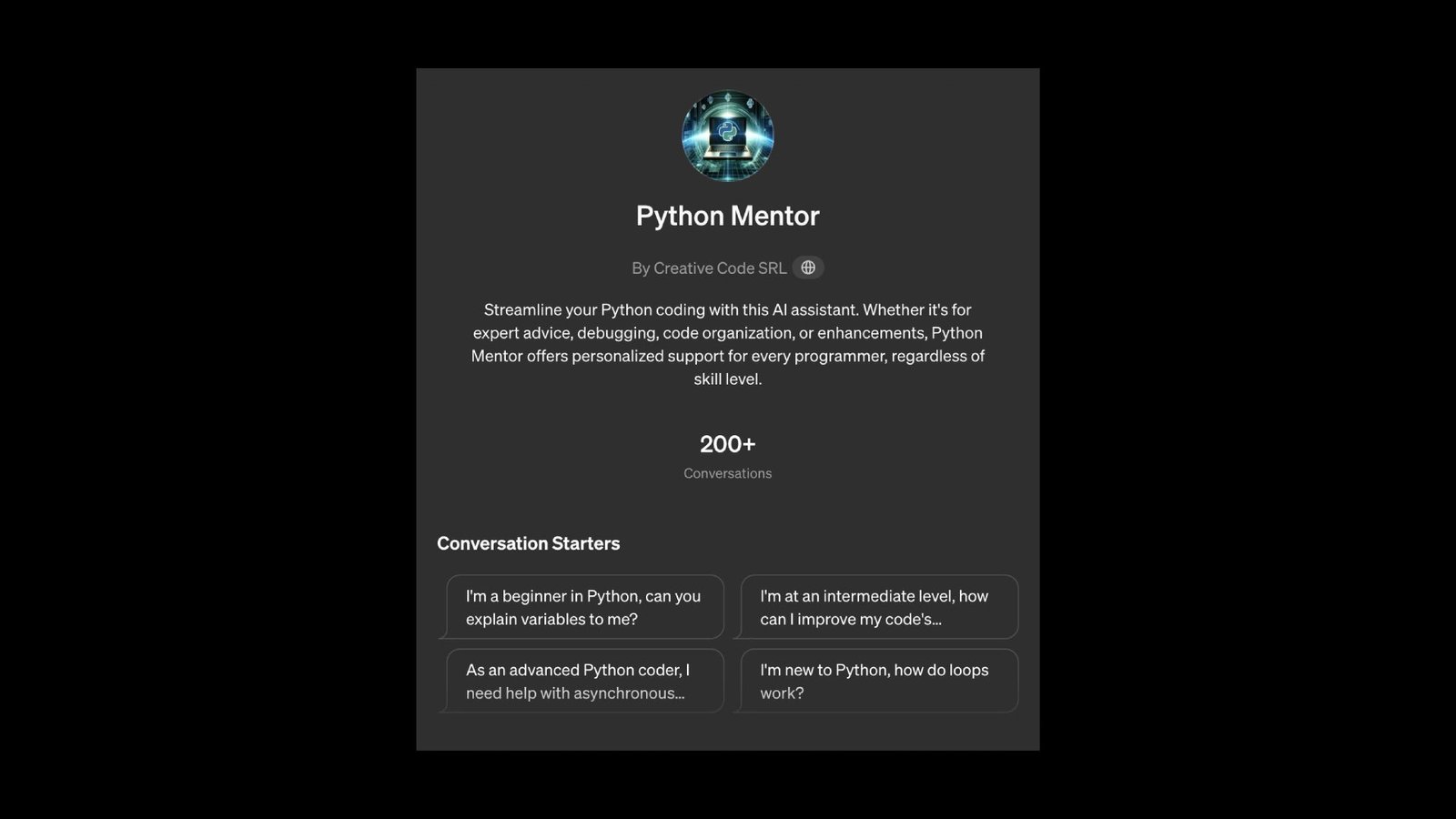If you are looking for an AI-based tool specialized in Python programming, look no further. This Pyton Mentor GPT will help you with expert advice, debugging, code organization, and more. Try it now!